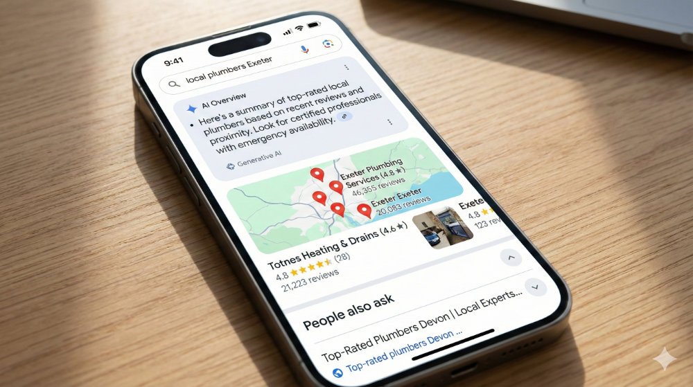 Google’s own data shows that nearly a large number of searches now end without a click to any website. For commercial queries like “plumber near me” or “best accountant in Exeter,” users see AI-generated answers, map results with reviews, and business profiles before they reach traditional organic listings.